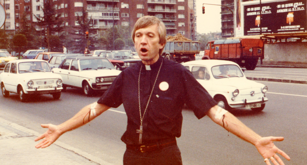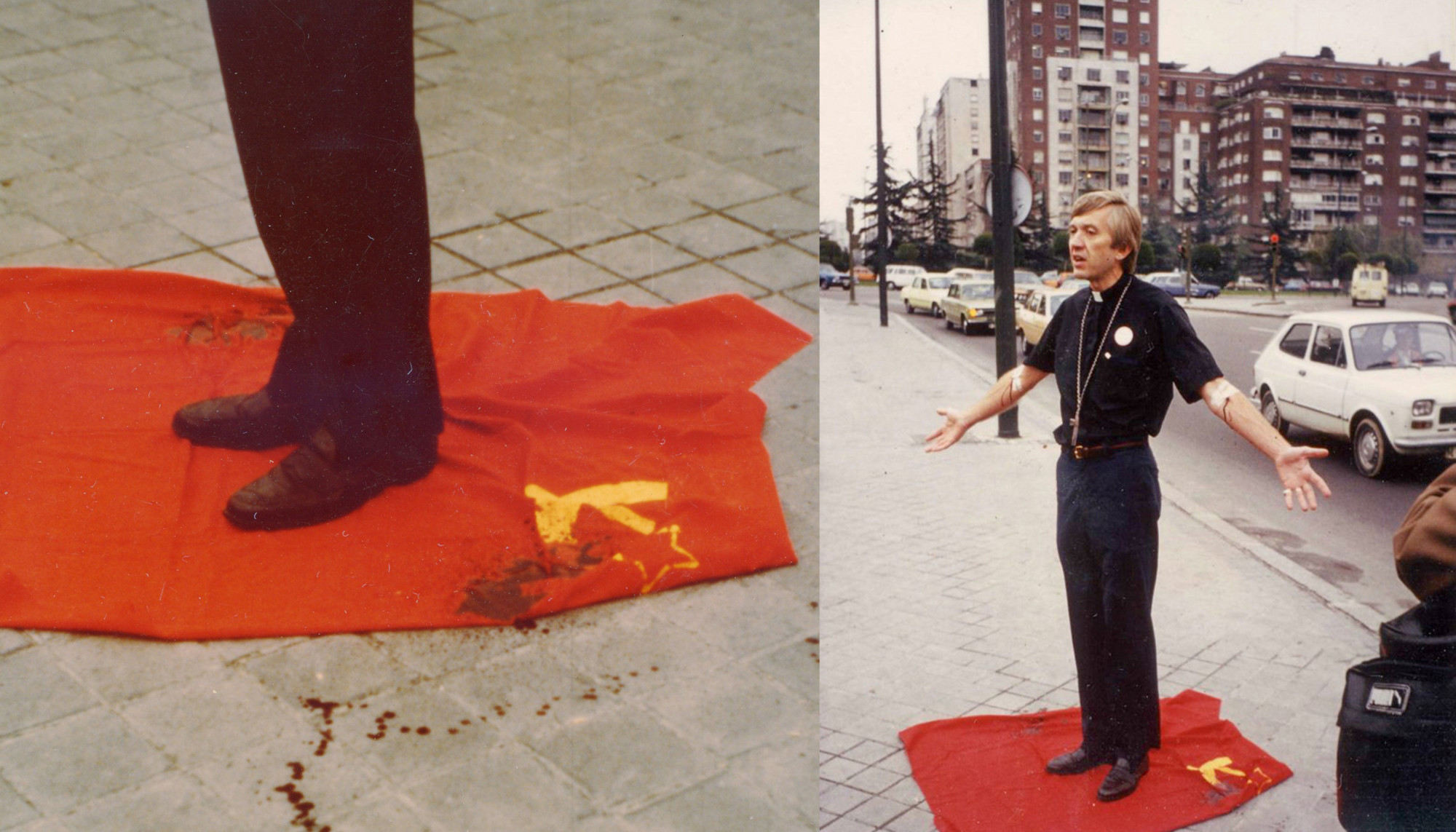 Mācītājs Māris Ķirsons uz PSRS karoga tecina asinis no vēnās iedurtām adatām, prasot brīvību un neatkarību Baltijai, Madridē Spānijā 1980. gada 11. novembrī. Foto no Māra Ķirsona privātā arhīva. / No Ģirta Zēgnera privātkolekcijas.