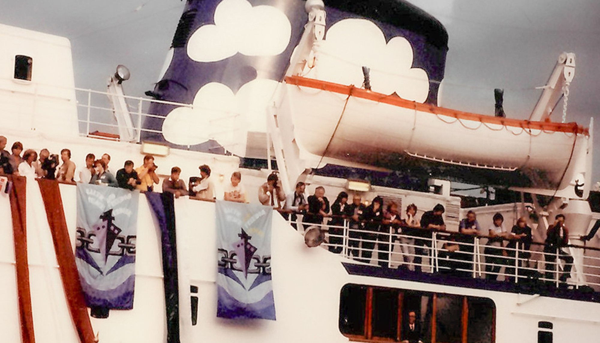 Skats uz “Baltijas brīvības un miera kuģa" akcijā izmantotā kuģa "Baltic Star" klāju. Priekšplānā akcijas karogi. Latvijas Okupācijas muzeja krājums.
