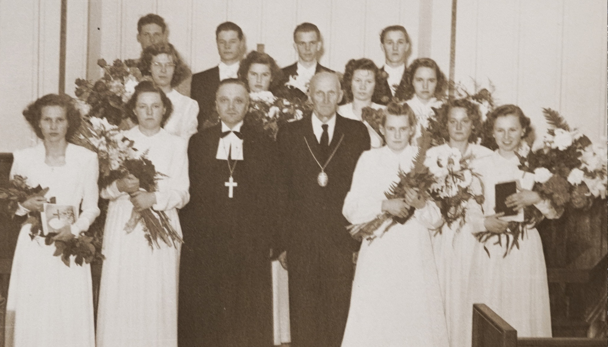 Māra Ķirsona tēvs mācītājs Pāvils Ķirsons (pirmajā rindā trešais no kreisās) pēc kristību vai iesvētes kalpošanas. Foto no Māra Ķirsona privātā arhīva.