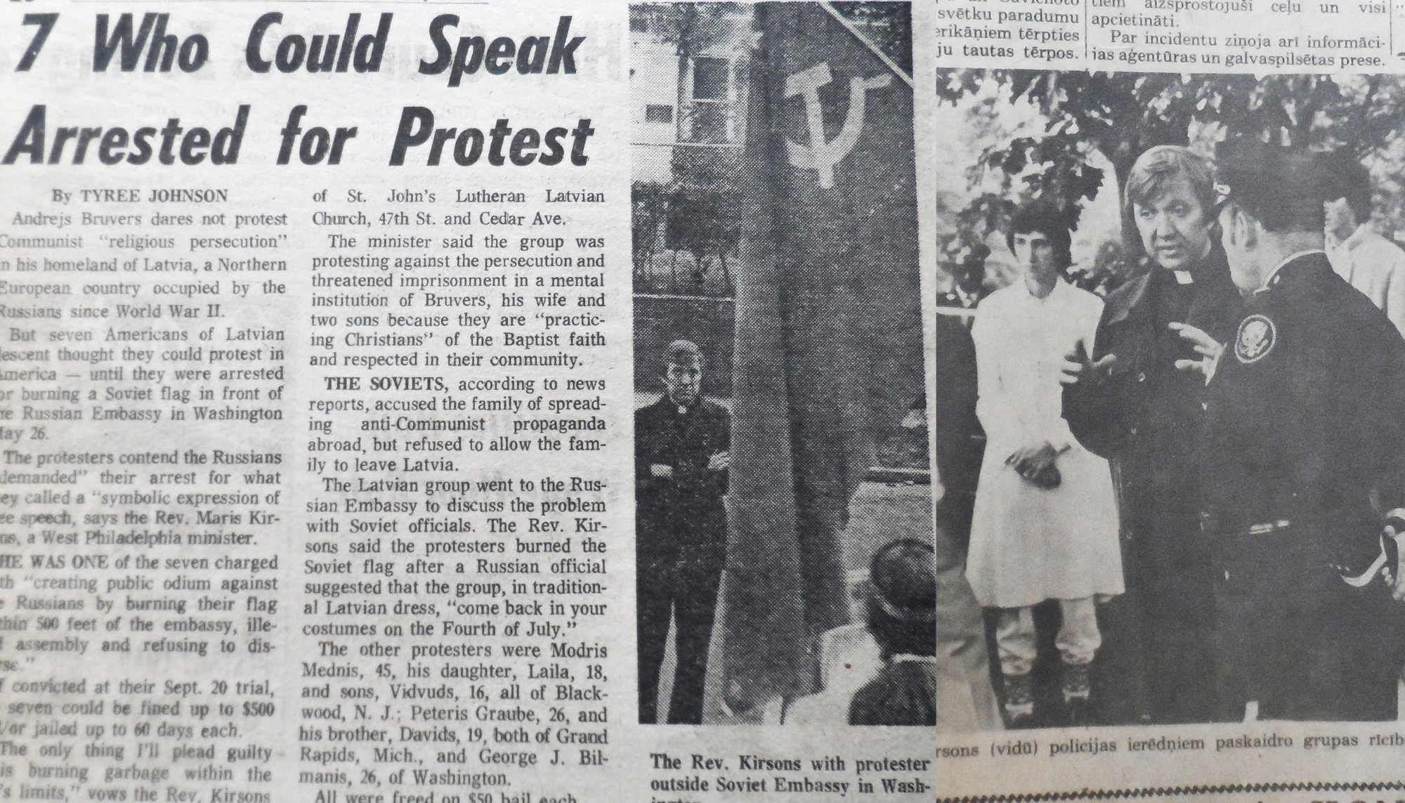 Publikācija par protestu pie Padomju Savienības vēstniecības 1976. gadā. No Philadelphia Daily News 1976. gada 25. jūnija numura. / No publikācijas par protestu pie Padomju Savienības vēstniecības 1976. gadā. No laikraksta latviešiem "Laiks" 1976. gada 2. jūnija numura.