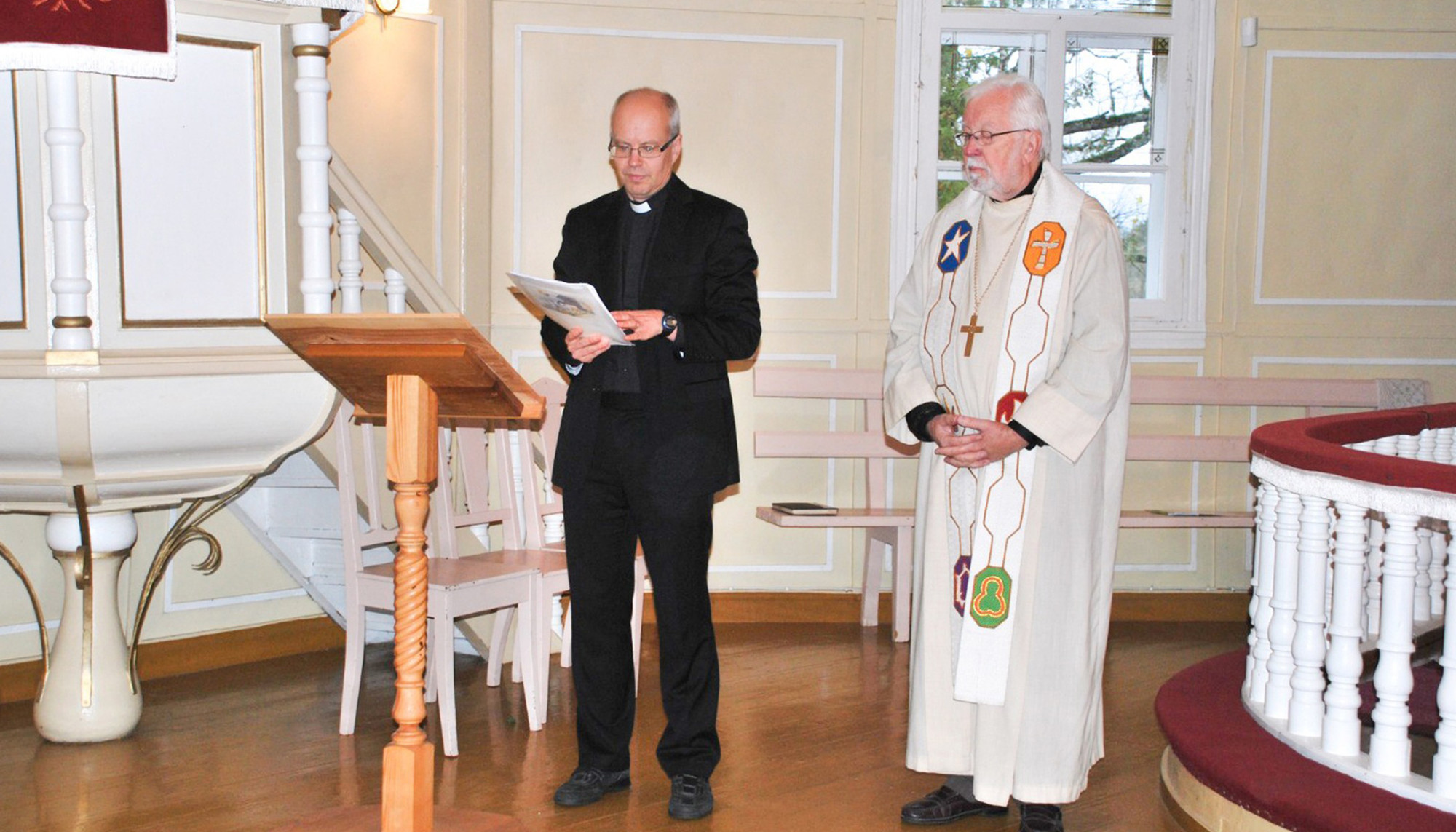 Mācītājs Edman Mats no Somijas Nykrleby Svētās Birgitas draudzes un mācītājs Māris Ķirsons (pa labi) Mērsraga draudzē. Foto no LELB Mērsraga draudzes arhīva.