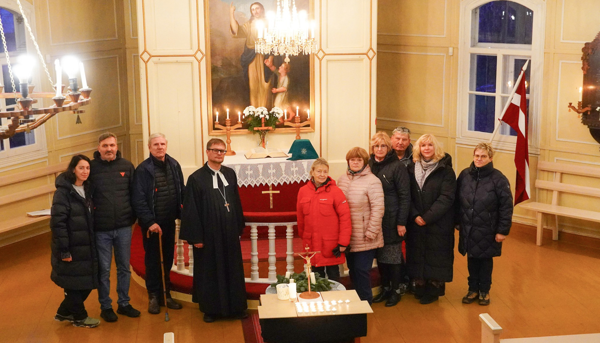 Mērsraga draudze ar prāvestu Mārci Zeifertu (ceturtais no kreisās) 2025. gada Mirušo piemiņas dienā Mērsraga draudzē.