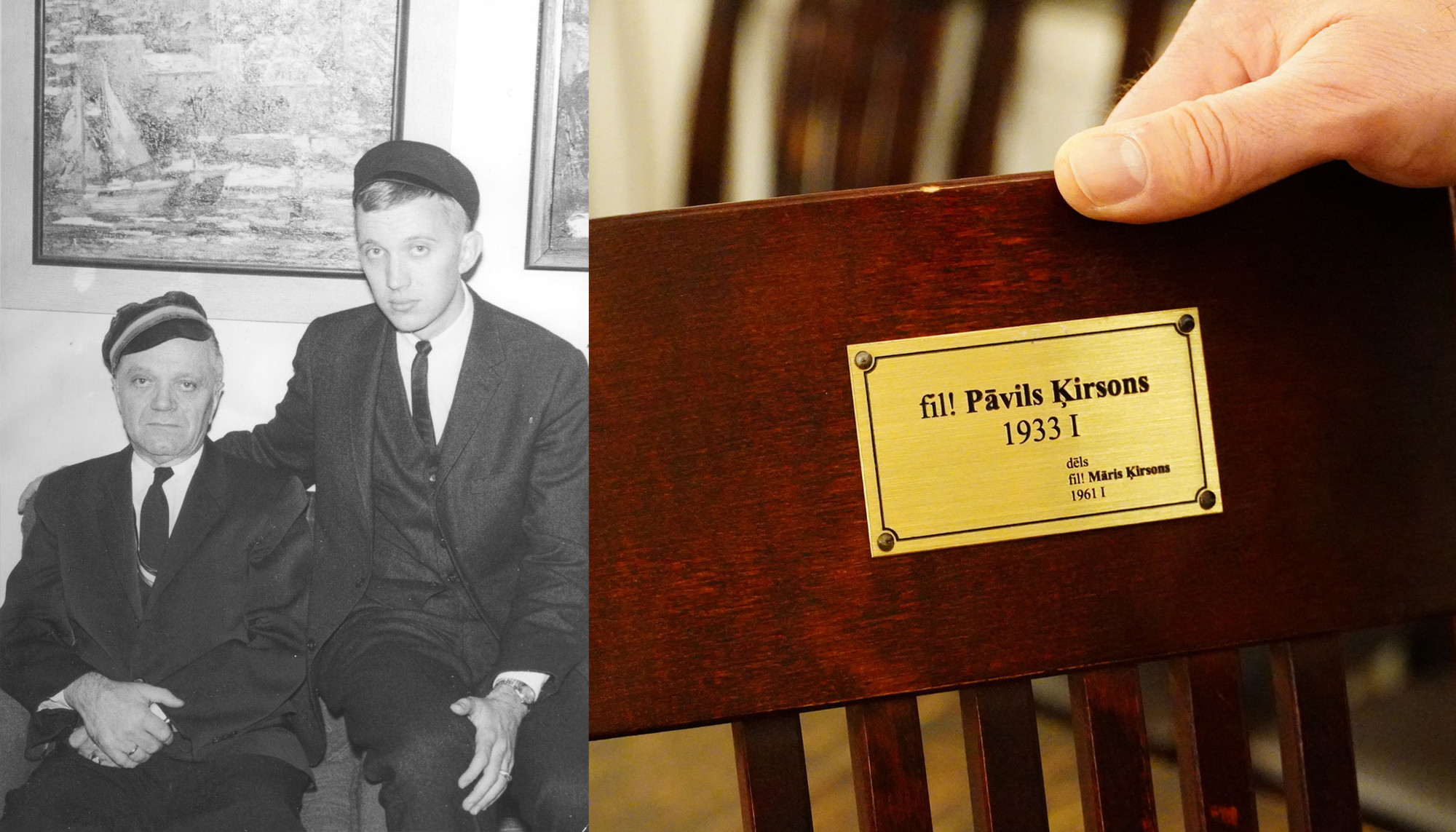 Tēvs, mācītājs fil! Pāvils Ķirsons, korporācijas Ventonia filistrs Čikāgā un viņa dēls vēstures students f! Māris Ķirsons. Studentu korporācijas Ventonia arhīvs. / Fil! Māra Ķirsona dāvātais krēsls sava tēva fil! Pāvila Ķirsona piemiņai.