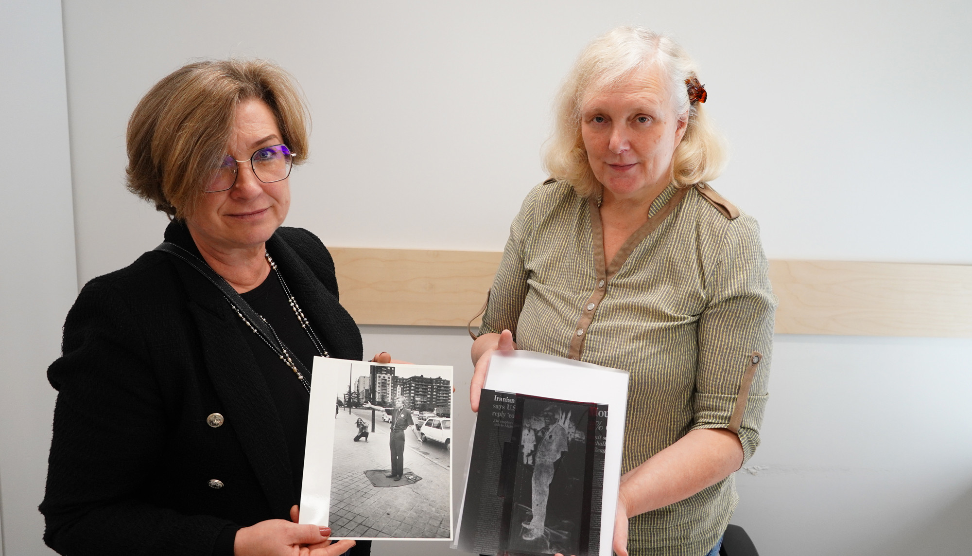 Māra Ķirsona dzīves biedre Irēna Pujāte (pa kreisi) dāvā Muzejam fotonegatīvu ar Māri Madrides protesta akcijā. Dāvanu pieņem Latvijas Okupācijas muzeja galvenā krājuma glabātāja Taiga Kokneviča.