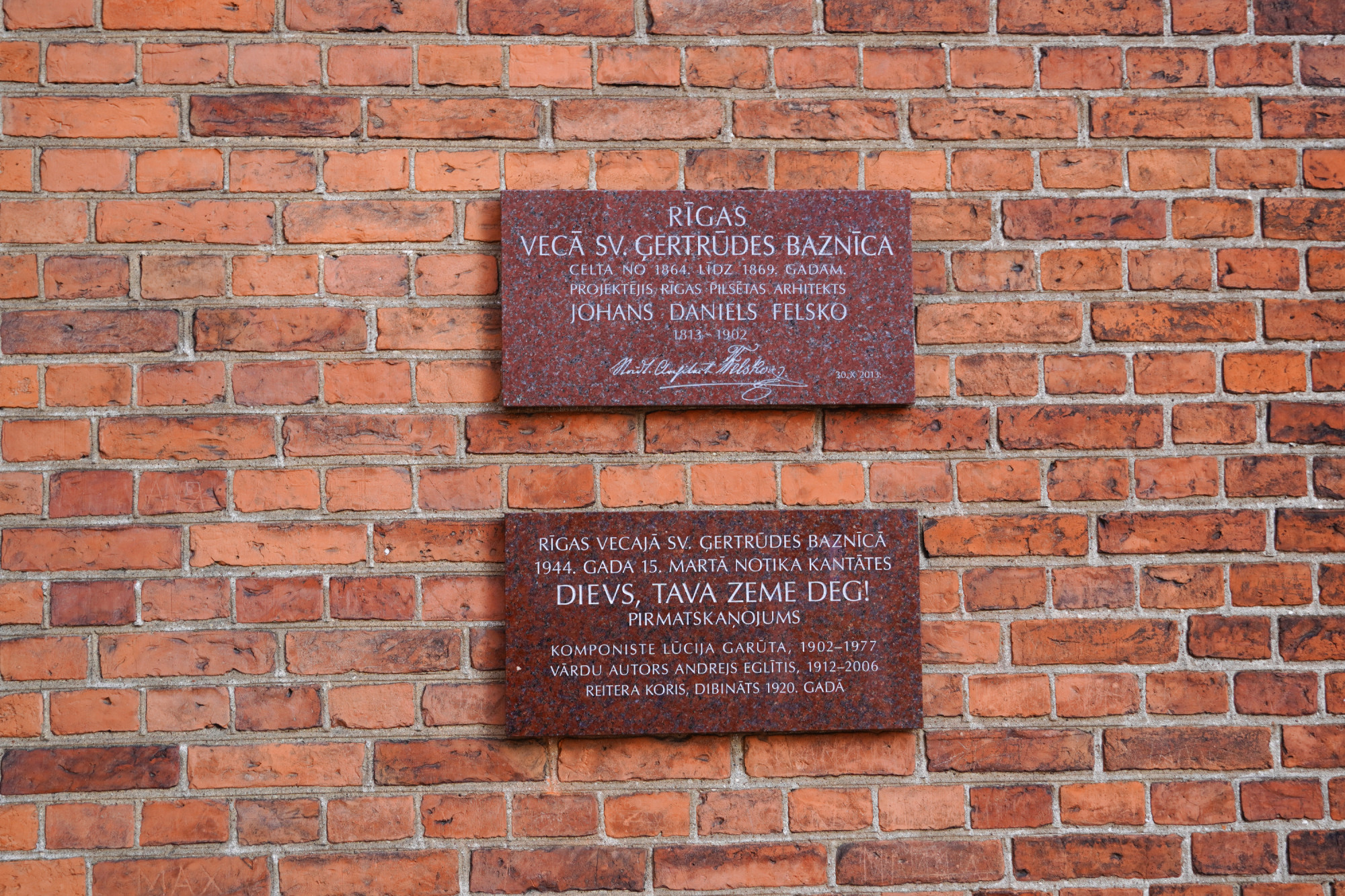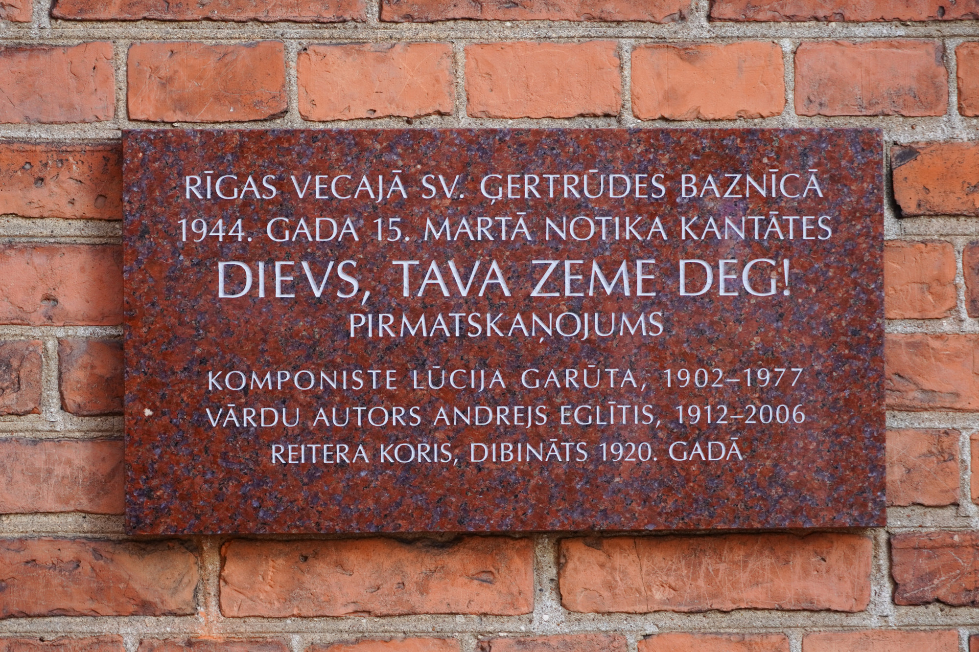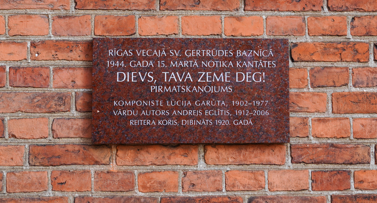 2026. gada 15. marta pusdienlaikā pie Rīgas Vecās Svētās Ģertrūdes baznīcas sienas tika atklāta piemiņas plāksne komponistes Lūcijas Garūtas un dzejnieka Andreja Eglīša kantātes Dievs, Tava zeme deg pirmatskaņojumam, kas šajā dievnamā notika trauksmainā 1944. gada 15. martā, pašai komponistei to spēlējot pie draudzes ērģelēm.