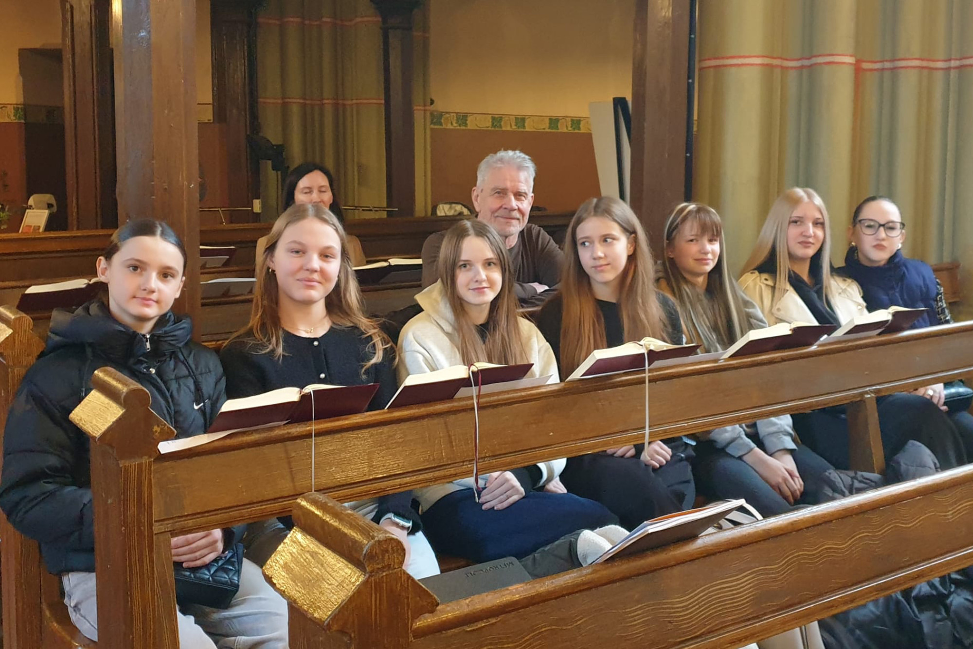 Viesi no Andreja Eglīša Ļaudonas pamatskolas. No kreisās: Karlīne Urbanoviča, Marija Gabriela Kalniņa, Marika Gabrusenoka, Līvija Lejiņa, Linda Bērziņa, Evelīna Timaškova. Otrajā rindā: skolas direktors Guntis Lazda.